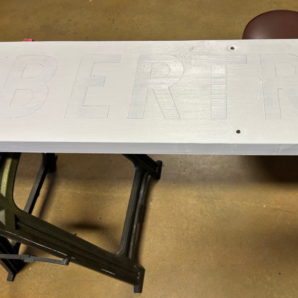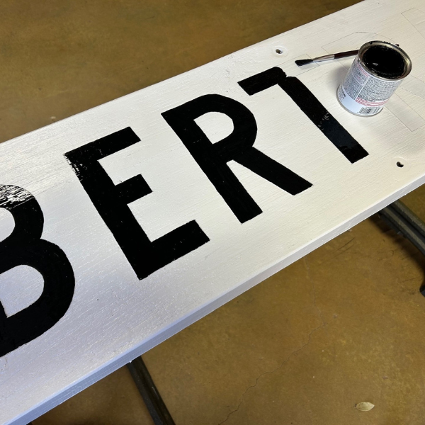 After the east sign was safely brought down (no small feat, given its size and weight), it was transported to the sign shop for restoration. The crew began by thoroughly cleaning and sanding the wood to remove debris and loose paint. Next, they applied two coats of exterior-grade paint to reseal the surface, carefully avoiding the original lettering so it wouldn’t be lost. Once the base coats dried, the lettering was meticulously retraced and repainted by hand, including the station name and the east and west terminal destinations. With the restoration complete, all that remained was reinstalling the refreshed station sign back on the Depot.