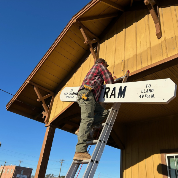 Their help didn’t stop there: David and Robert also unbolted and lowered the heavy wooden station sign mounted on the east end of the Depot, a solid 2-inch-thick slab measuring 8½ feet long. That sign needed some love as well, and off it went for restoration. These hand-painted, prototypical station signs are mounted on both the east and west ends of the building. Created to meet Southern Pacific Railroad Common Standards, they reflect the heritage of the line we operate between Austin and Burnet.