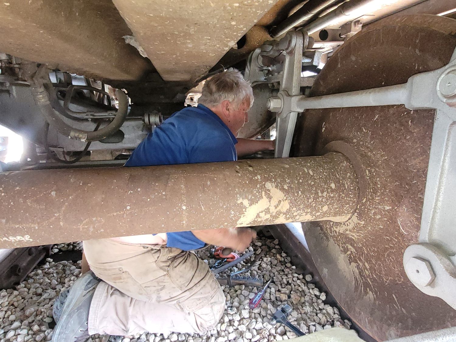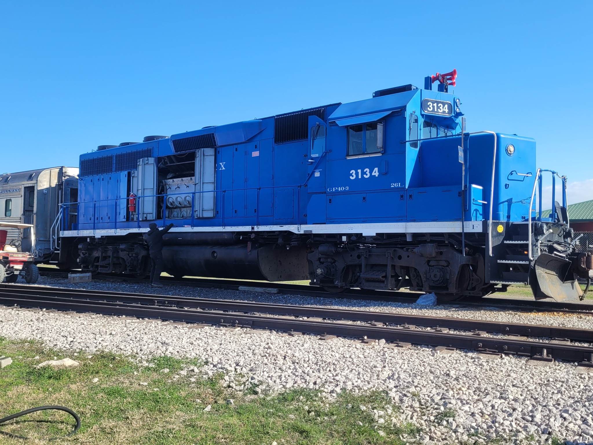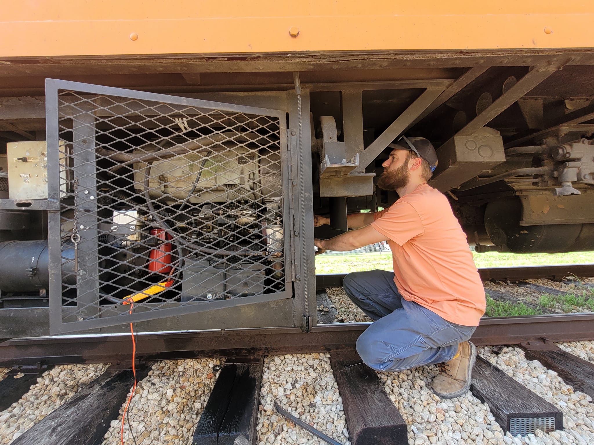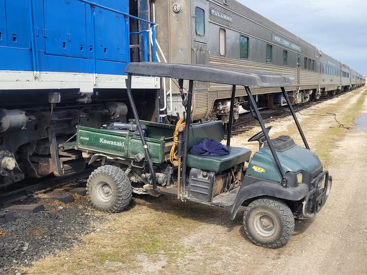 For years, the diesel generator under the Maurice Beckham reliably powered our lounge cars’ HVAC systems. Though our new power car now handles that task, the Beckham generator remains our trusted backup. Recently, a significant metal failure occurred on the radiator, but thanks to Bennie, Matt, and our mechanical crew, the generator was removed, and Abe Doss expertly repaired the damage. Now, it’s ready to serve as our backup if needed.
