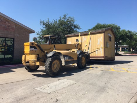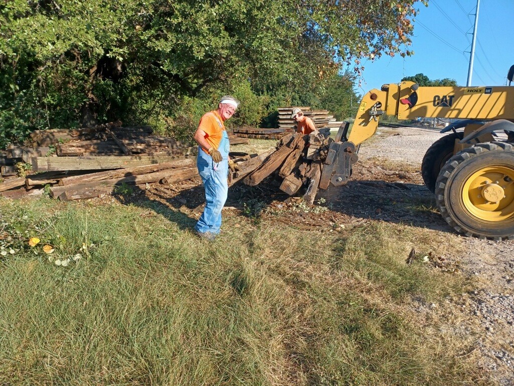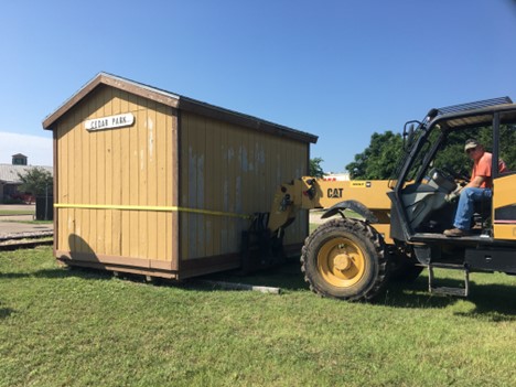 Years ago, we acquired a wooden storage building that we used for storing tables and chairs. It was initially placed along the east track of our Wye in Cedar Park. Over time, it became an obstacle and needed refurbishing. So, we decided to move it. We had customized fork extenders made by Doss Metals to lift the building. Tom Fitzgerald, our retired crane operator from the Chicago & Northwestern Railroad, carefully picked up the building and moved it to its new location in the yard. It was gently transported past Building 30, a switchman’s shanty from the Southern Pacific Railroad that was rescued in Houston. The building is now in its new location, ready for restoration.