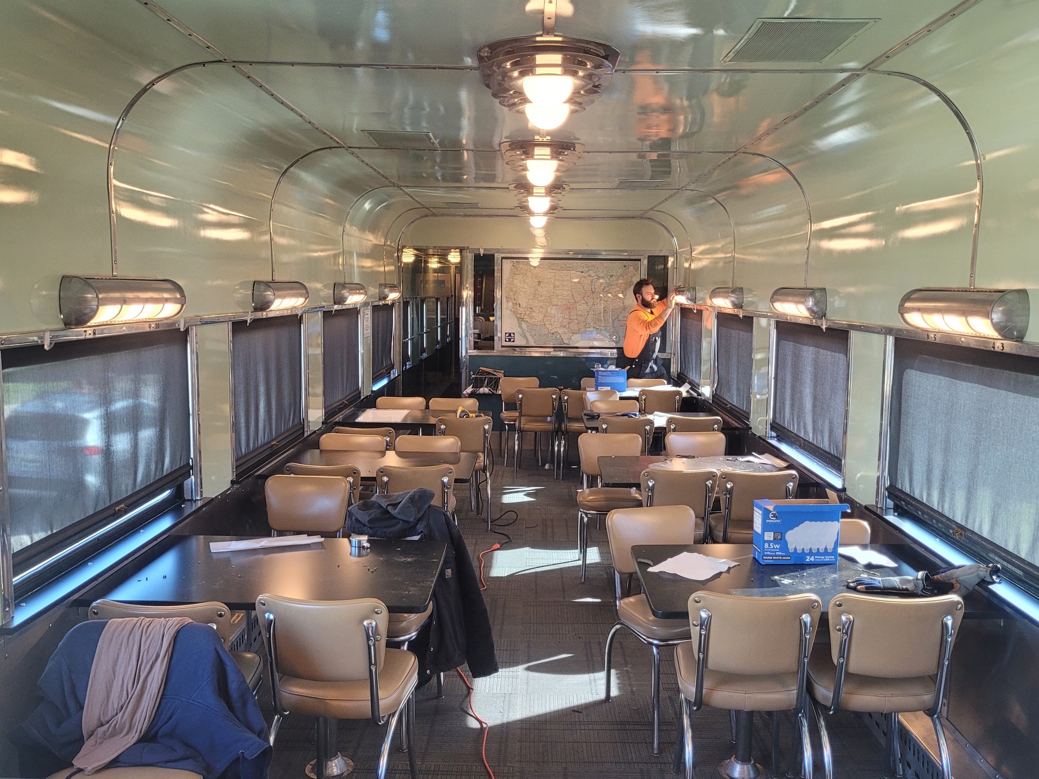 A few years ago, the volunteers of the Gulf Coast Chapter of the National Railroad Historical Society acquired an ex-Southern Pacific dining car from Amtrak. Since then, they have been diligently repairing and refurbishing the car to prepare it for service on ASTA trains. Recently, they purchased all new windows, and today marked the beginning of the process to replace the badly crazed plexiglass windows with real glass. The volunteers are tackling the learning curve with enthusiasm and dedication. (Yes, it will be SP on the outside, and vintage early Amtrak on the inside with some cool interior features!)