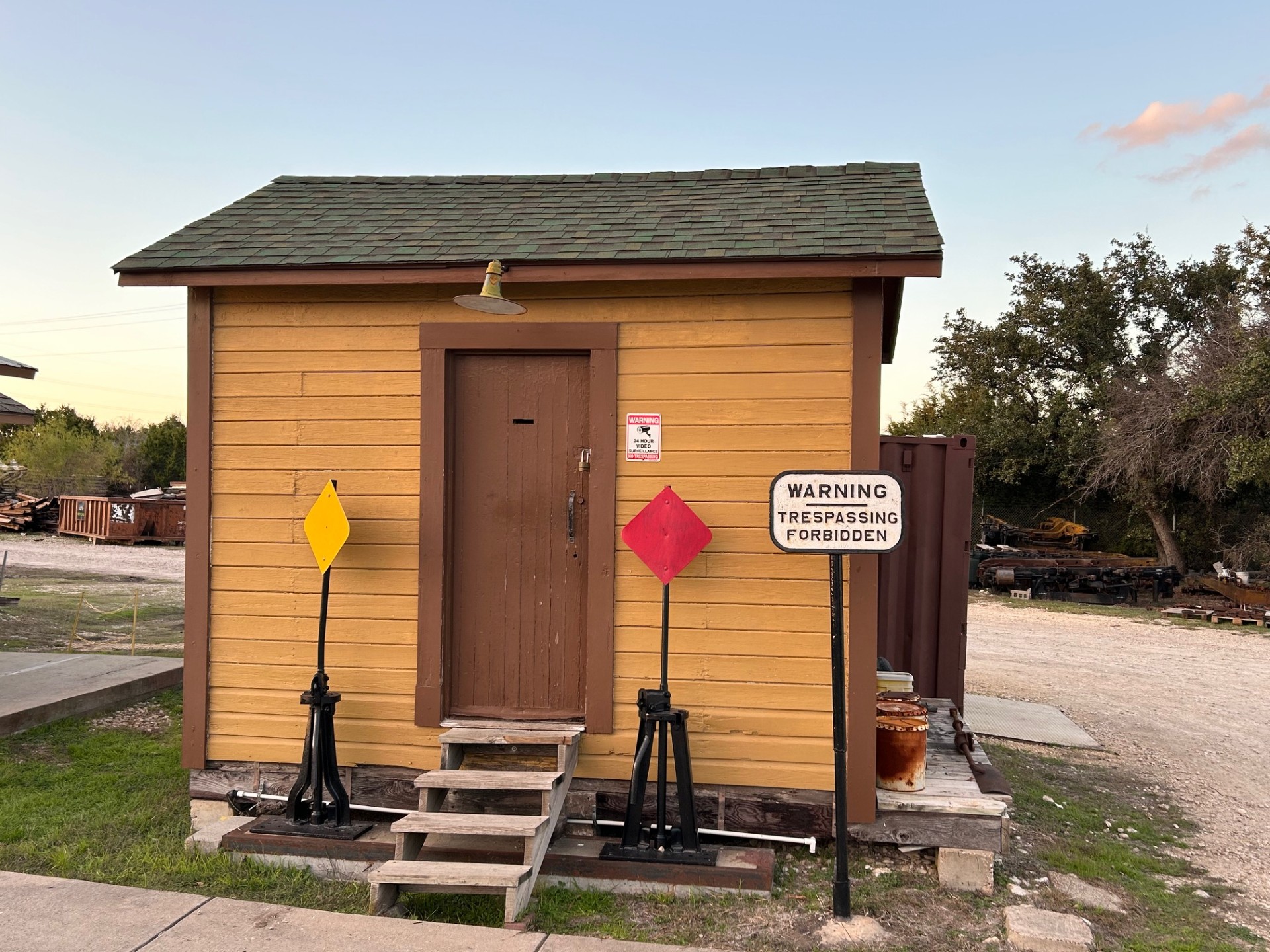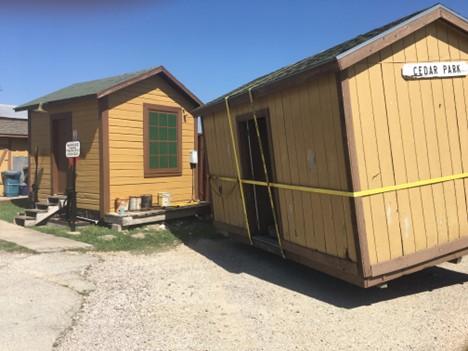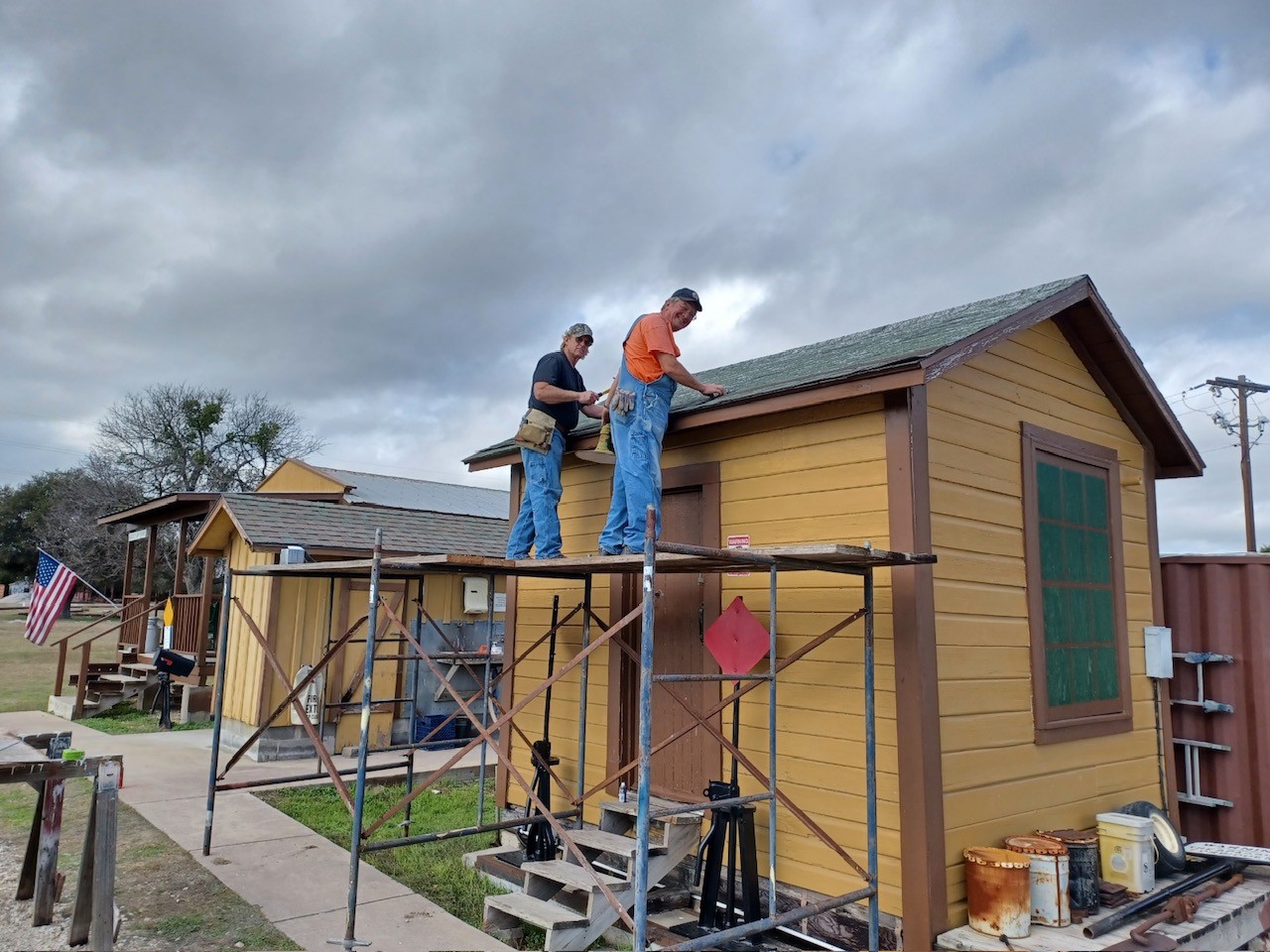 About 25 years ago, ASTA acquired an old Southern Pacific switchman’s shanty from Houston, moved it to our Cedar Park Yard, and restored it for use as a materials storage building. This small but important structure, known as Building 30, serves as a workspace for Tino, our yard assistant, who keeps our train cars clean and ready for service. As part of the original restoration, the shanty received a brand-new shingle roof. Fast-forward to today, and that roof had reached the end of its lifespan. Just before Christmas, three dedicated volunteers stepped up to tackle the much-needed re-roofing project. After setting up scaffolding to safely access the roof, they began applying a fresh layer of fiberglass shingles over the worn, but smooth, existing layer. By the end of the day, Building 30 had a brand-new roof, ensuring it remains a sturdy and functional space for years to come. A huge thank you to our volunteers for their hard work on this project! Check out the transformation below.