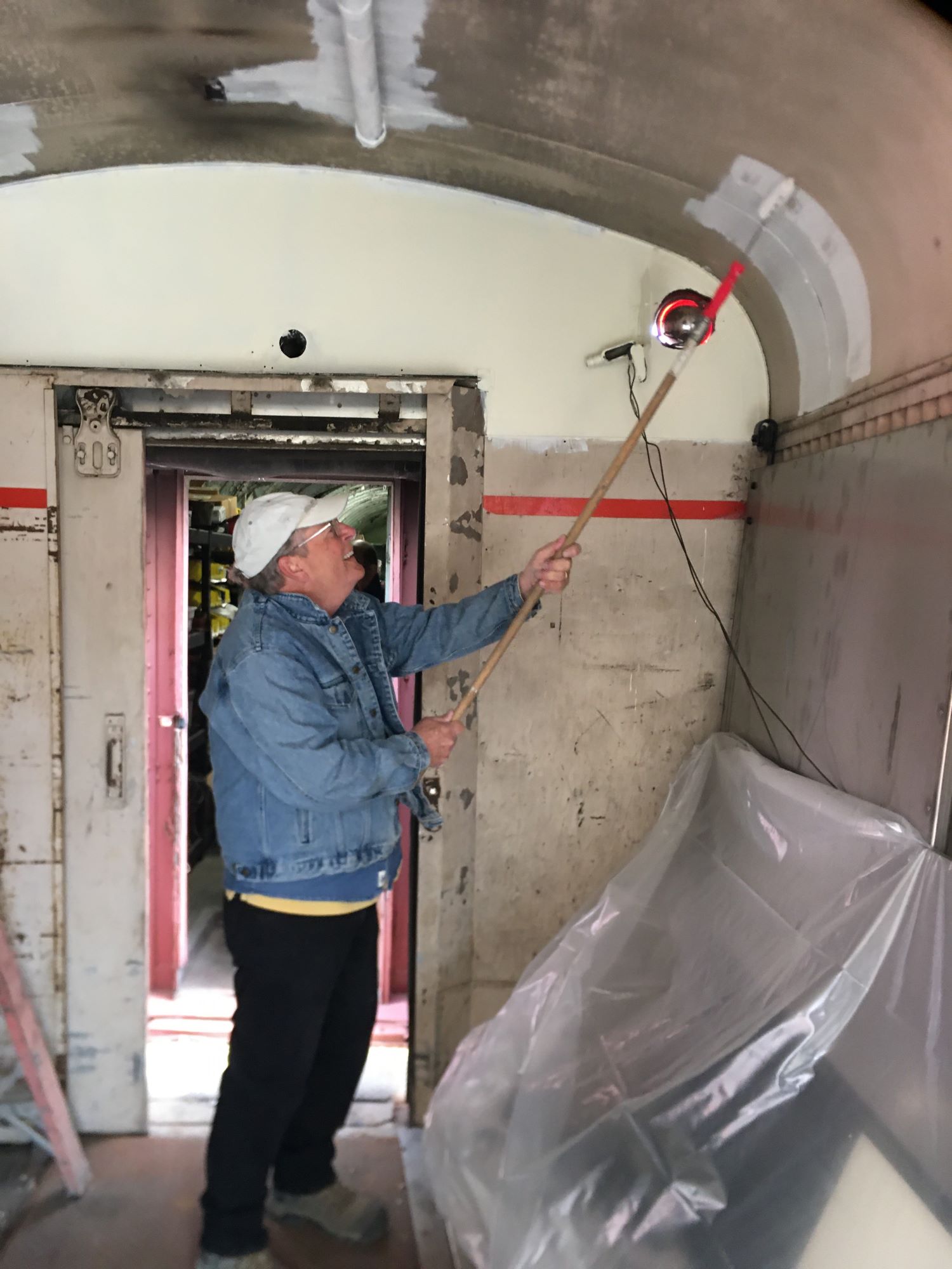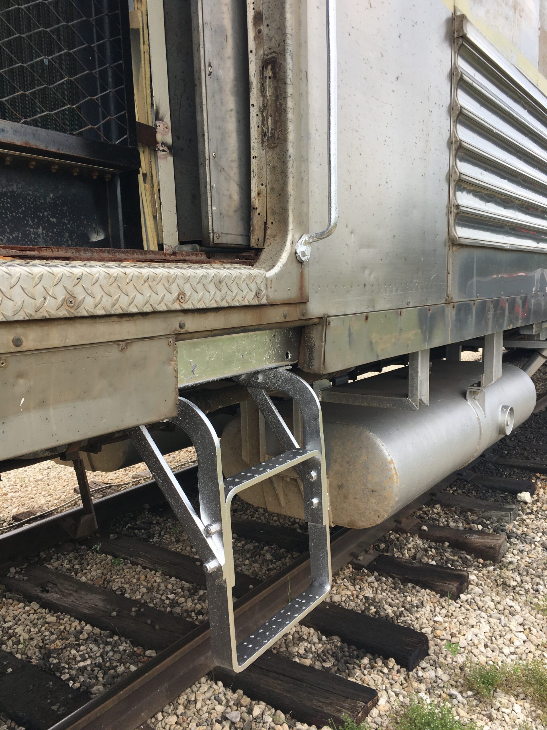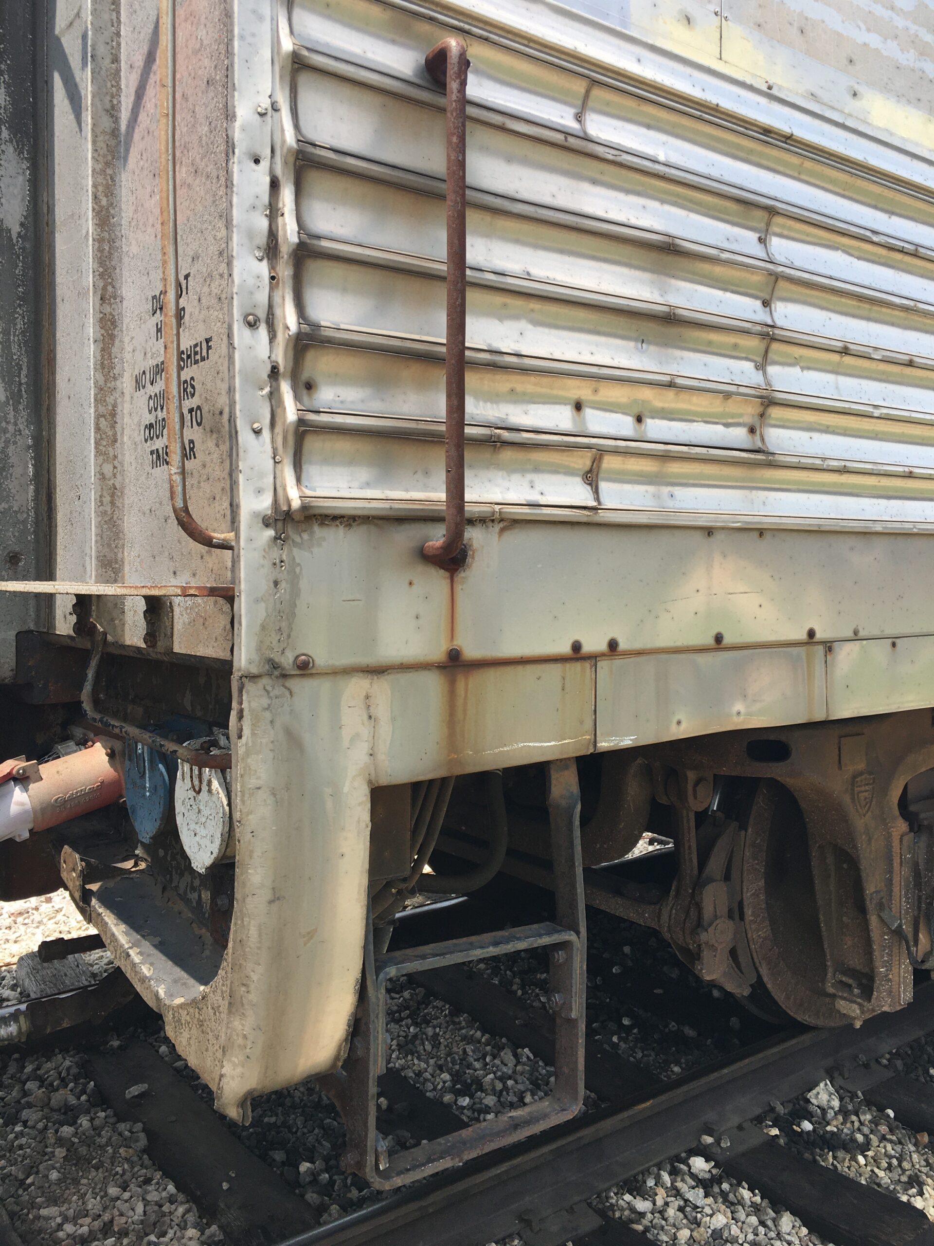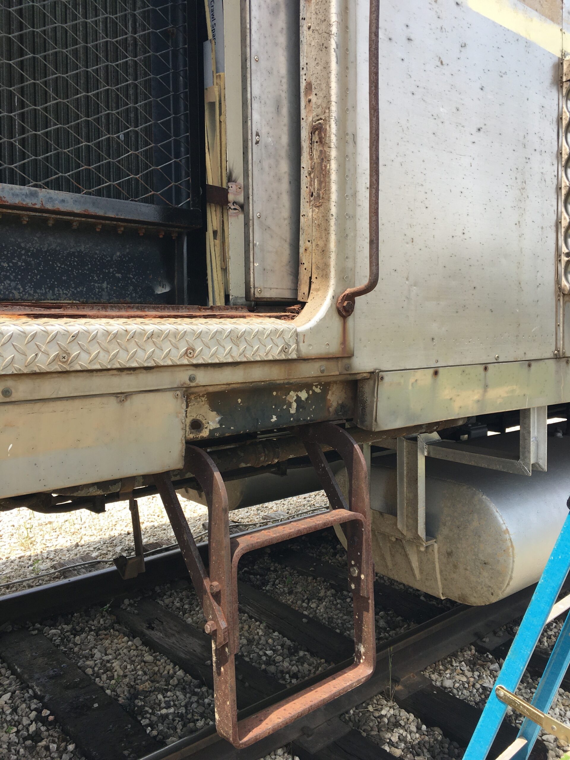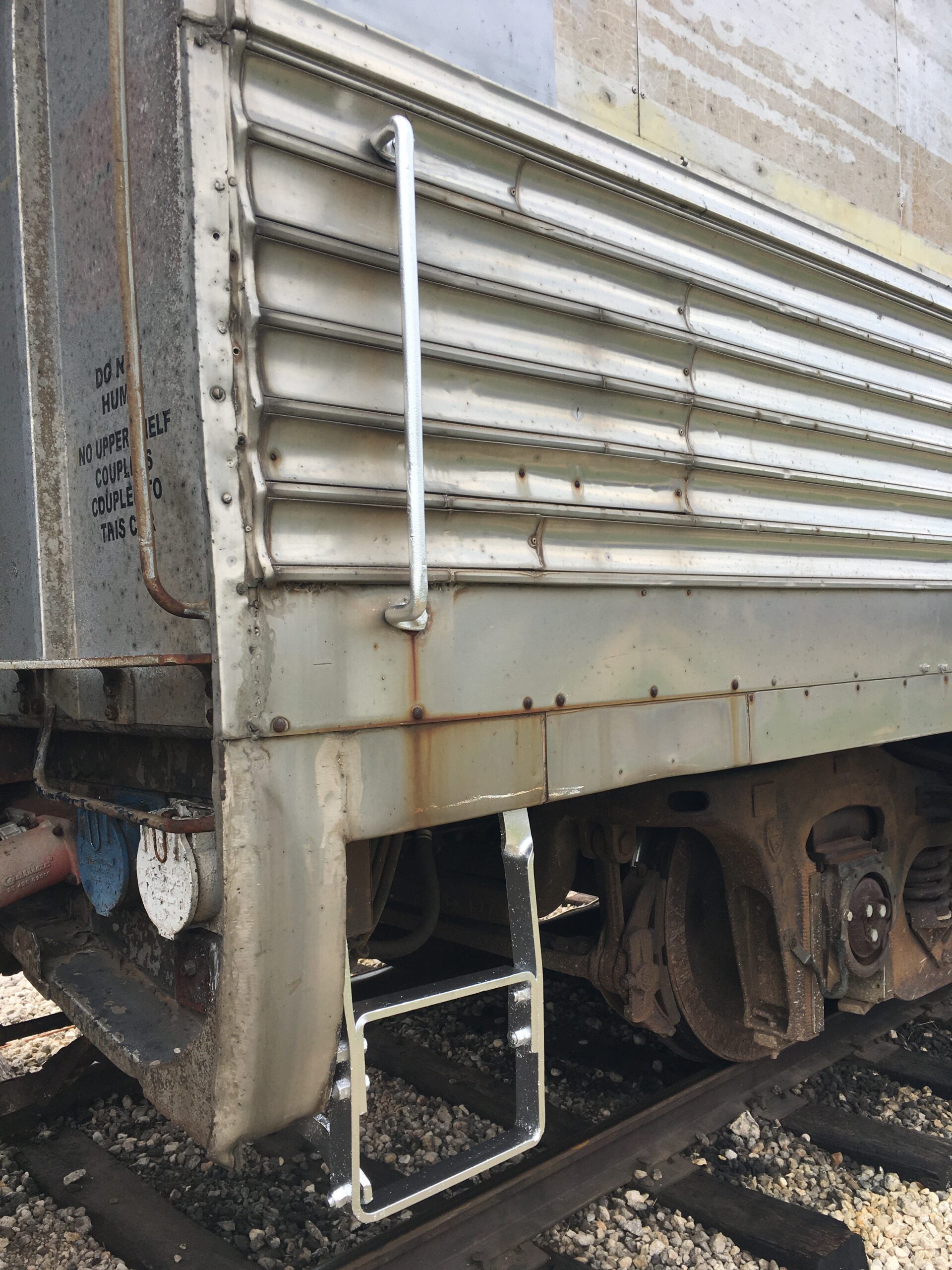 Now that our volunteers have mastered the inner mechanical workings of the Power Car (ATCX 1244), it’s time to focus on the exterior aesthetics. Some of the exterior grab irons and stirrup steps are rusty and in need of a fresh coat of silver paint for weather protection. This will also enhance their visibility for our train crew’s safety. Check out the before and after pictures below.
